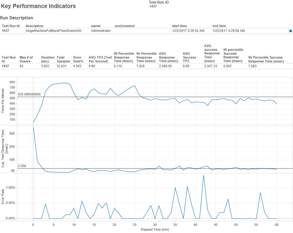The ~1600 second mark is right about where tests per minute dipped below the hourly average and response time increased.