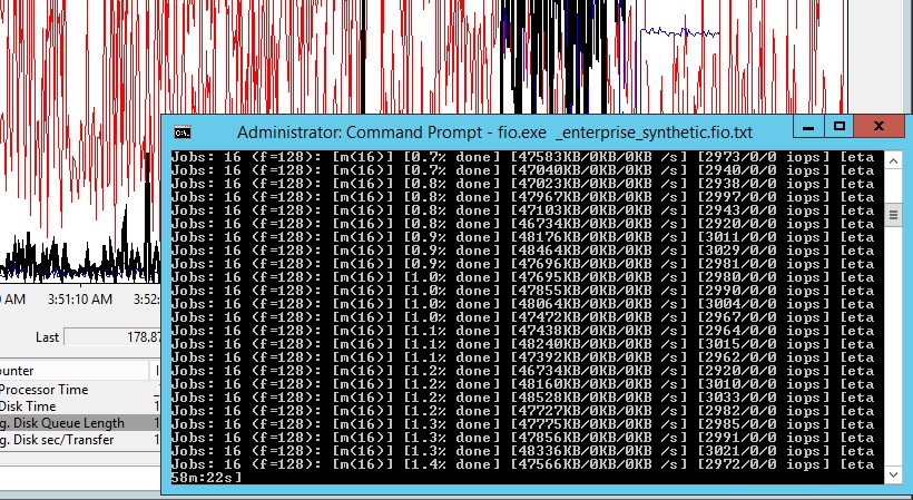 During this time, both disk latency and average disk queue jumped to unacceptable levels on drive D: