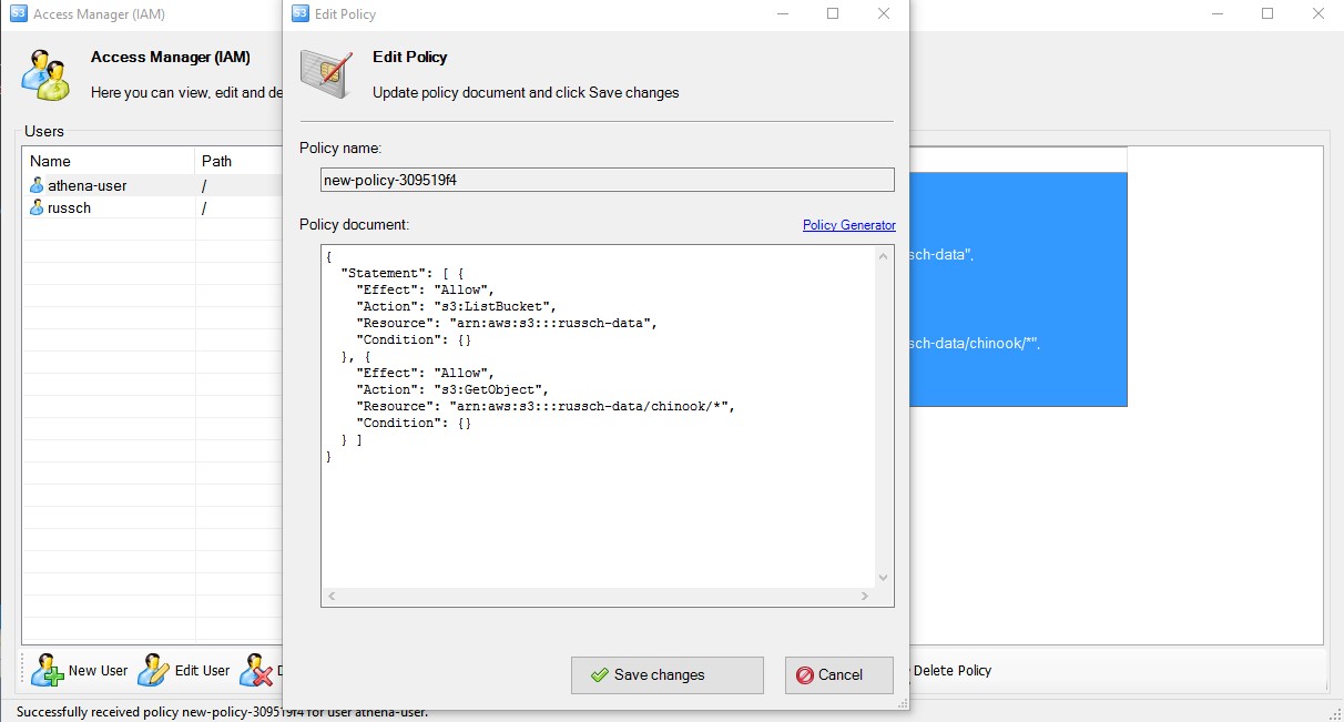 For example, my “athena-user” ran into the error above after I built the viz while logged in as the IAM user who actually owned the s3 bucket in which the “Athena data” lives. Moral of the story: just because it works for you doesn’t mean it’ll work for others. Add a bucket or user policy granting access to the resources. Below, I’ve created a user policy which resolved the error above for athena-user: