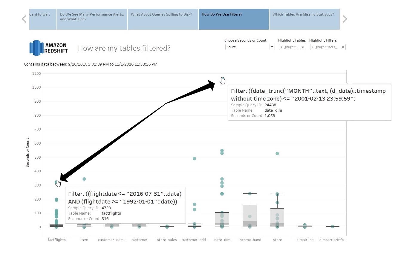 For example, perhaps you’re not sure where to put your sort keys. We’ve got a viz which reports which table / column combinations are being used in WHERE clauses from your queries: